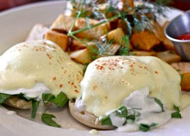 Poached eggs, smoked salmon, English muffin, hollandaise sauce. Served with homefries, blueberry bran muffin